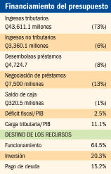 La iniciativa estima un presupuesto que alcanzaría los Q59 mil 547.4 millones, financiado principalmente con ingresos fiscales (73%). El Gobierno espera que los ingresos tributarios alcancen los Q43 mil 611.1 millones o un 12.5 por ciento más que los ingresos que por el mismo concepto financian el presupuesto vigente. Se prevén recursos por la aprobación de la “ley antievasión II” y otras medidas administrativas.