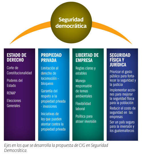 Cualquiera que sea el ganador, los dos aspirantes que compiten en la ronda final por la Presidencia de la República –Manuel Baldizón y Otto Pérez Molina– han aceptado agregar a sus programas de Gobierno la propuesta de Cámara de Industria de Guatemala (CIG) “Una agenda para progresar más y mejor”. Estos lineamientos fueron discutidos con ambos candidatos y sus equipos técnicos y está dividida en cinco grandes ejes: Seguridad democrática, Fortalecimiento del mercado interno, Inversión con Responsabilidad Social, Funcionalidad del Estado y Desarrollo y reconversión rural. A su vez, estas áreas de trabajo descansan en cuatro grandes pilares, que incluyen el Estado de Derecho, Respeto a la propiedad privada, Libertad de empresa y Seguridad física y jurídica. Las presentaciones con los Presidenciables son parte del proyecto “CIG Propone”, una iniciativa apoyada también por la embajada de Taiwán.