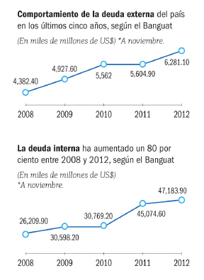 En 2012 la deuda externa e interna siguió la misma línea de crecimiento; en los últimos cinco años ambas han aumentado en un 43 y 80 por ciento, respectivamente.