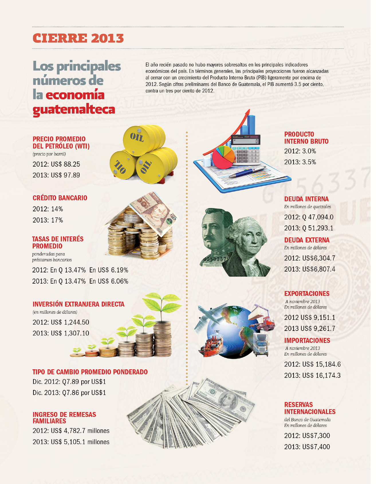 El año recién pasado no hubo mayores sobresaltos en los principales indicadores económicos del país. En términos generales, las principales proyecciones fueron alcanzadas al cerrar con un crecimiento del Producto Interno Bruto (PIB) ligeramente por encima de 2012. Según cifras preliminares del Banco de Guatemala, el PIB aumentó 3.5 por ciento, contra un tres por ciento de 2012.