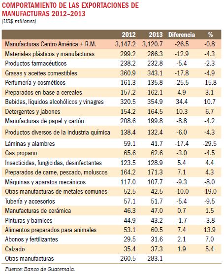 La industria manufacturera se afianzó a la cabeza de los principales sectores exportadores de Guatemala, según informe preliminar del Banco de Guatemala. Del total de las exportaciones, representó el 43.2 por ciento o el equivalente a US$3 mil millones en divisas. Además es fuente directa de trabajo formal para unas 170 mil personas y un millón de plazas indirectas de empleo.De acuerdo con los registros del banco central, el principal mercado sigue siendo Centroamérica, a donde el país exportó el 61.5 por ciento de sus productos (US$ 1 mil 921 millones). El 38 por ciento restante se distribuyó en los mercados de Estados Unidos, Sudamérica, el Caribe, Asia y Europa.Los subsectores más dinámicos fueron los de alimentos y bebidas (seis por ciento), detergentes y jabones (6.7 por ciento) y abonos y fertilizantes (siete por ciento). Luego se ubicaron los productos plásticos (10.7 por ciento), bebidas (7.8 por ciento), productos farmacéuticos (7.5 por ciento) y productos de perfumería y cosméticos (5.5 por ciento).