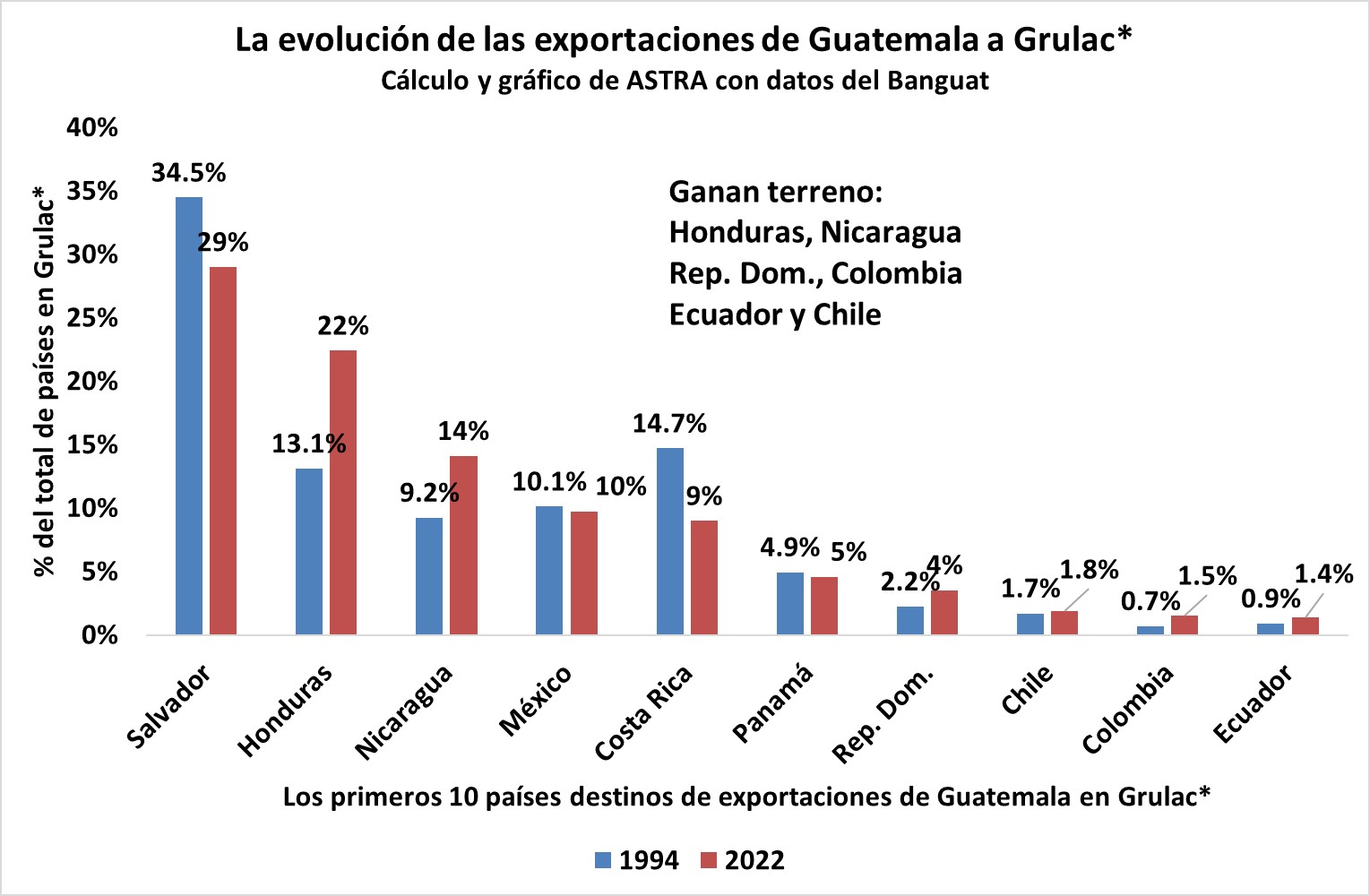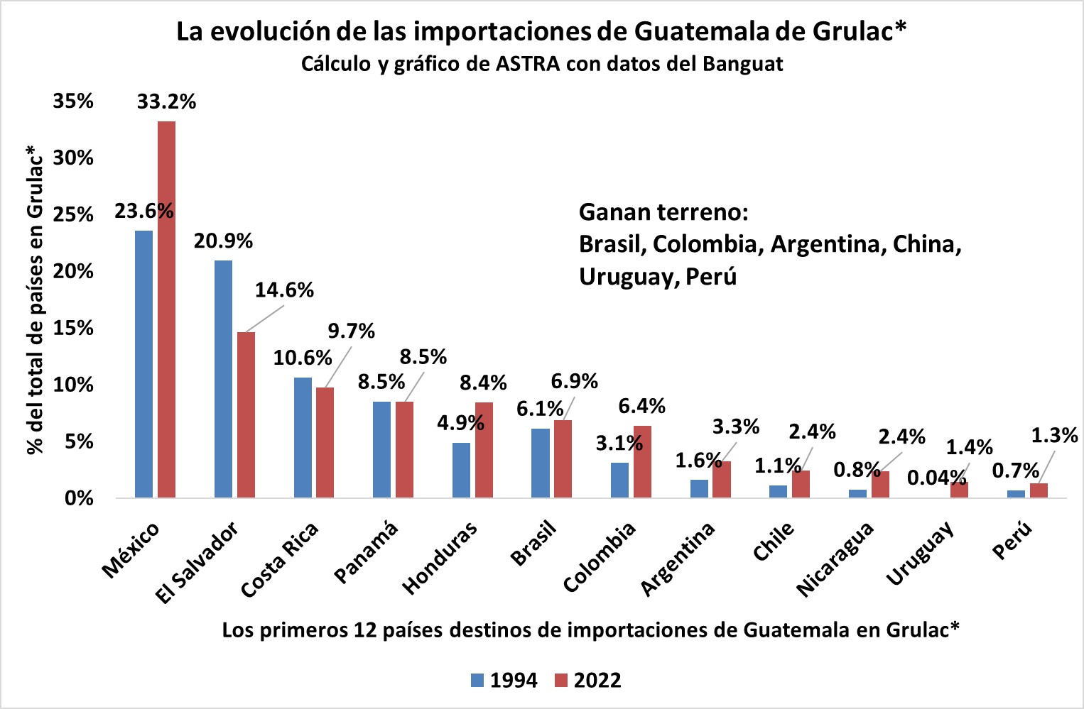 Los datos del Banco de Guatemala (BANGUAT) dejan ver la importancia del comercio de Guatemala con algunos países de Grulac, aunque no se pueden analizar los datos para todos los países miembros, debido a que el comercio con algunos es relativamente bajo, por lo que se agrupan en la categoría de “Otros países” que utiliza para englobar el comercio con países alrededor del mundo que individualmente no representan una cantidad significativa de exportaciones o importaciones con Guatemala. Por lo anterior, se utilizará el término Grulac* para indicar el grupo de países del grupo donde el BANGUAT reporta datos específicos para exportaciones e importaciones.